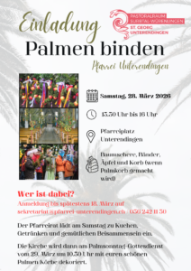 Dafür brauchen wir fleissige Helfer und Helferinnen, die beim Palmenbinden mitmachen. Dieses Jahr findet es am Samstag, 28. März um 13.30 Uhr auf dem Pfarreiplatz Unterendingen statt.