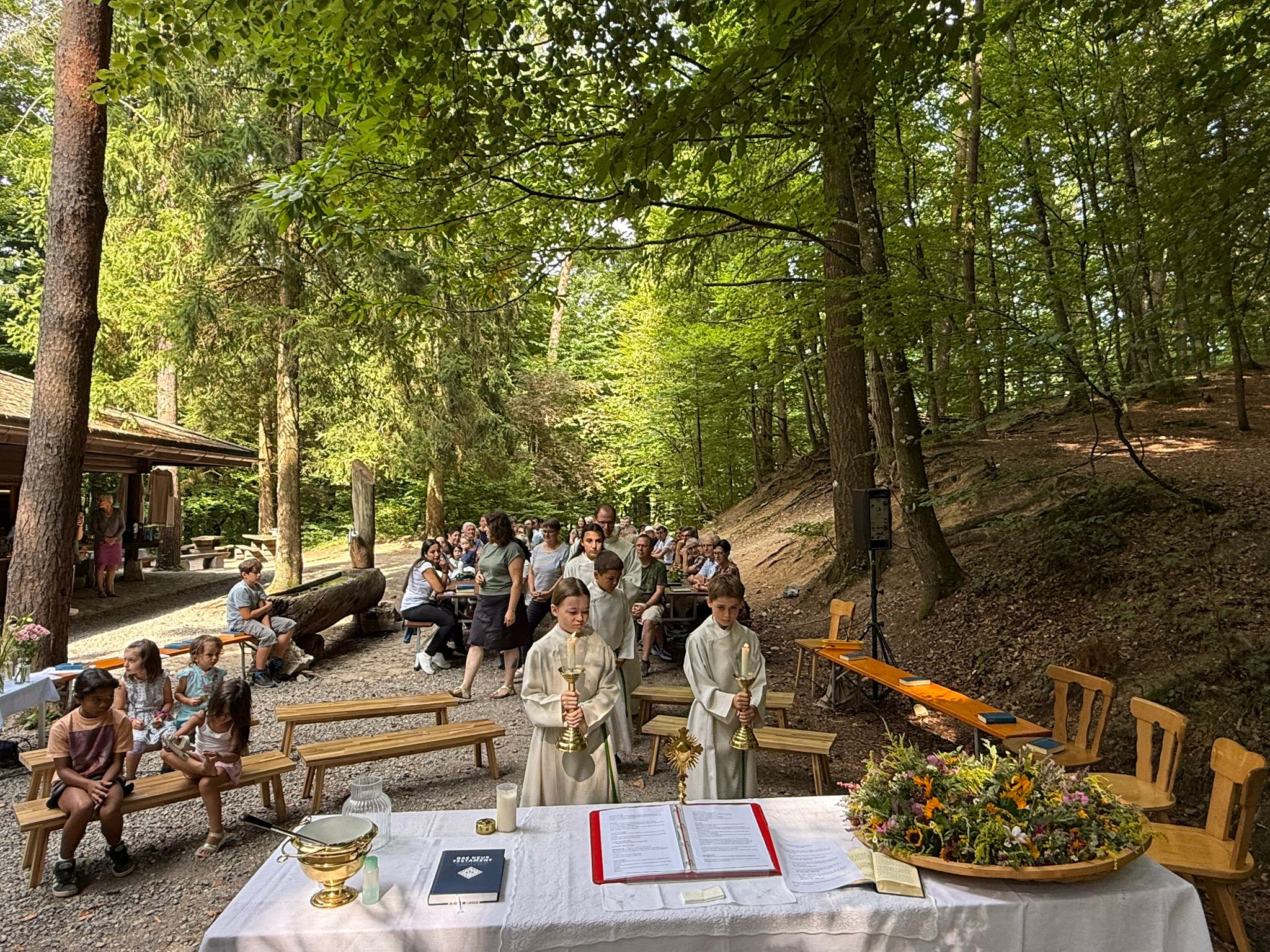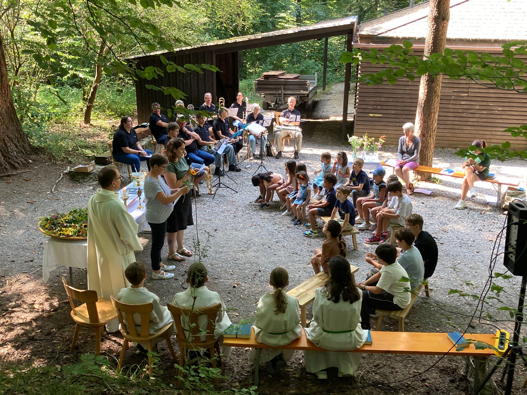 (nd) Der diesjährige Schulstartgottesdienst wurde bei schönem Wetter und angenehmen Temperaturen, bei der Waldhütte unter dem grünen, schattenspendenden Blätterdach durchgeführt. Viele Gottedienstbesucher, darunter ethliche Familien, sind zu Fuss gekommen! Alle Tische waren volll besetzt, besonders viele Kinder waren heuer da! Es war schön, als grosse Geminschaft zusammen zu feiern und den Schulsegen zu empfangen!