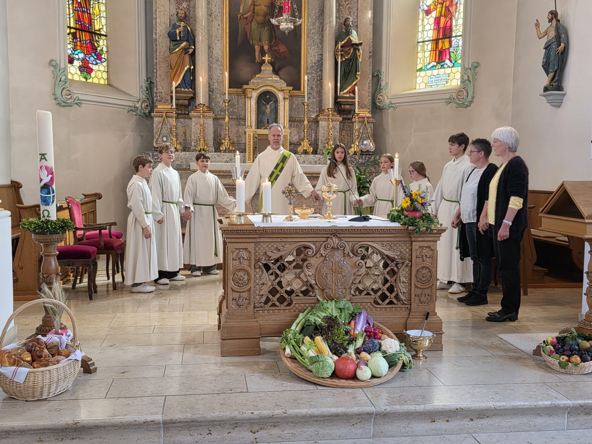 Die Familie Frey hatte vor dem Altar eine kunstvolle Erntedank-Dekoration aufgebaut: Früchte, Gemüse und verschiedene Brotsorten wurden liebevoll arrangiert und im Rahmen des Gottesdienstes gesegnet. Im Anschluss waren alle Gottesdienstbesucher eingeladen, sich etwas auszusuchen und mit nach Hause zu nehmen – ein Zeichen der gelebten Gemeinschaft und des Teilens.