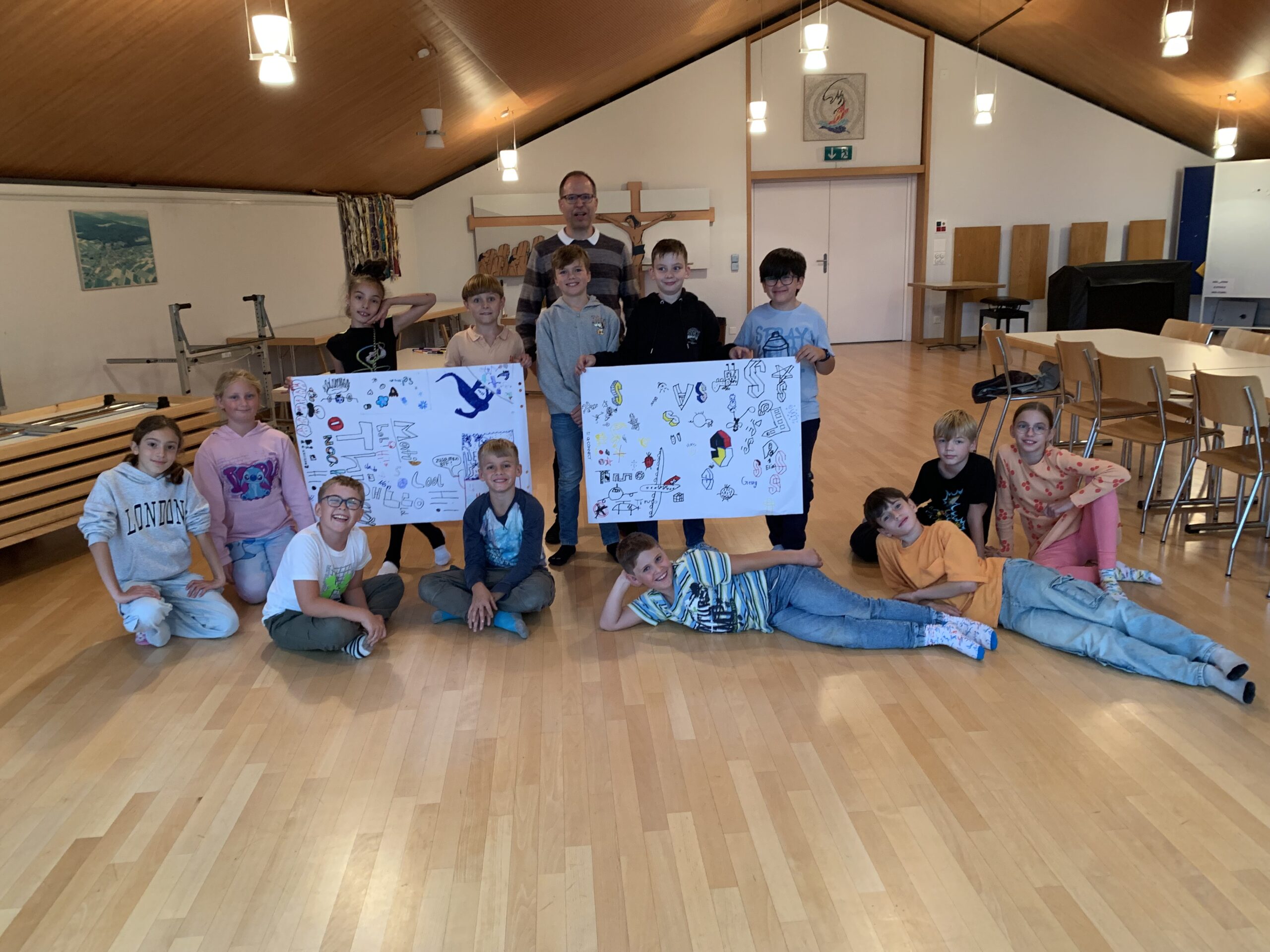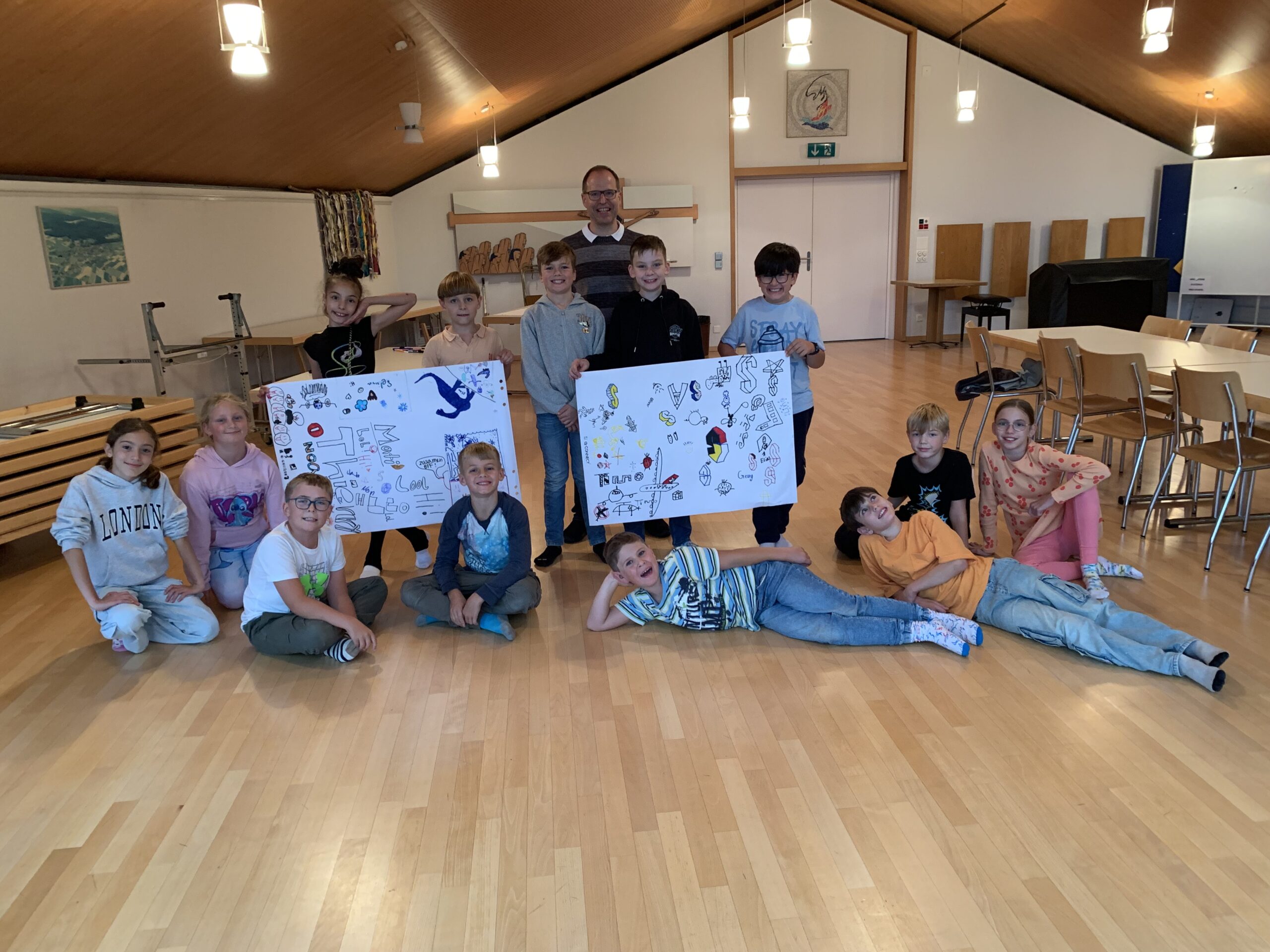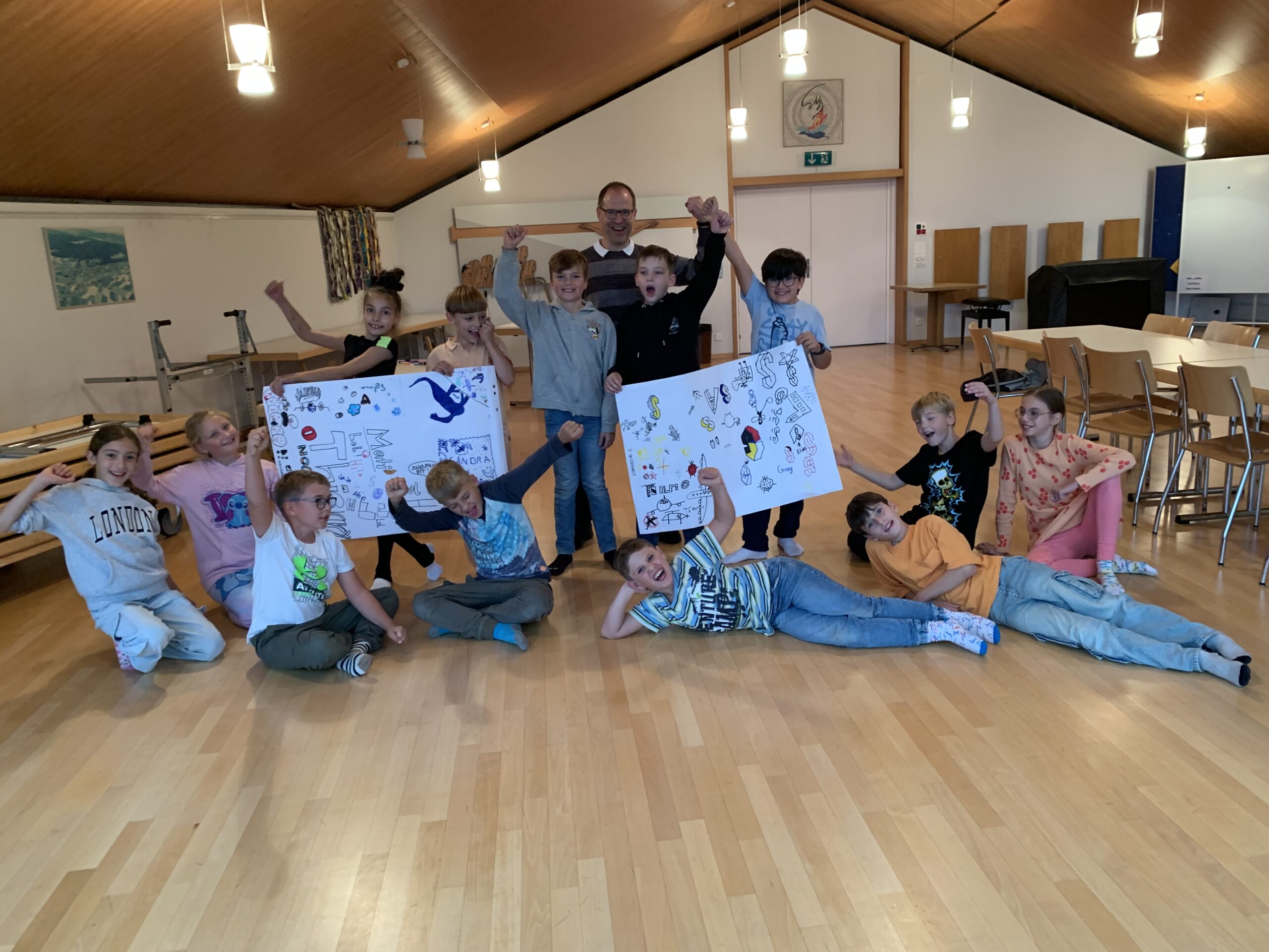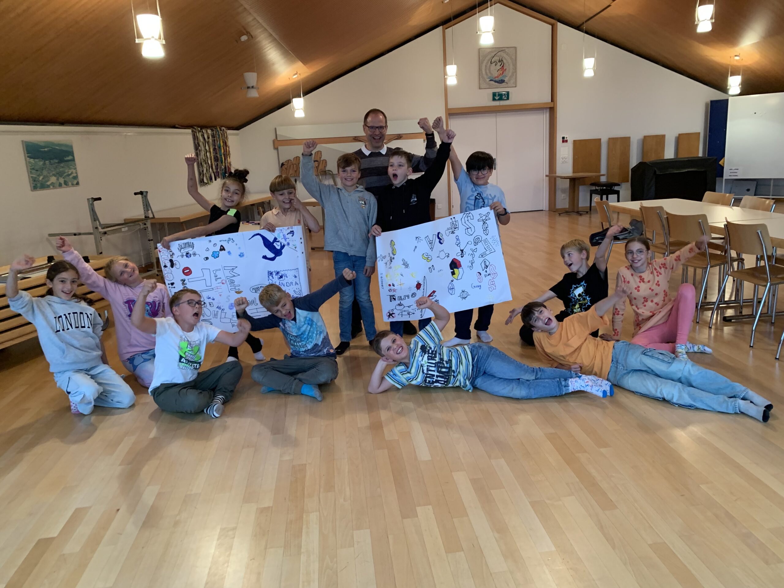 Der Abend begann mit einem feinen Znacht – jede Menge Pizza für alle – und danach wurden 2 grosse Plakate gestaltet mit den Namen und Zeichnungen der Kinder. Stolz wurden diese mit aufs Gruppenfoto genommen.